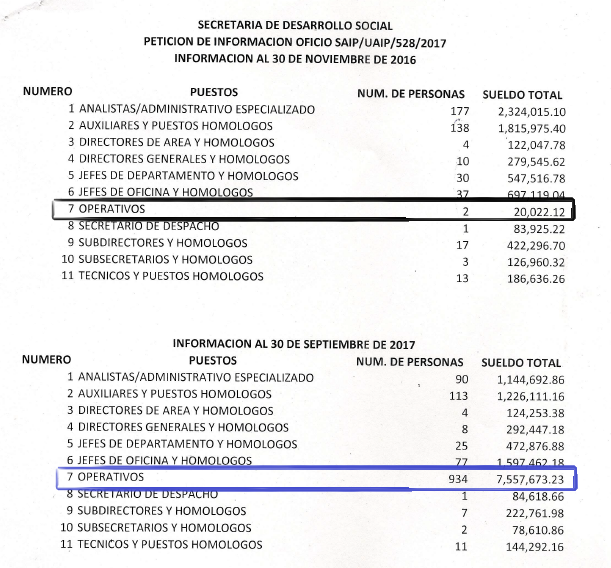 Para hacer la operación contrataron un ejército de “operativos” para realizar la talacha, los cuales se repartieron por todo el estado: 934, en total, de acuerdo con la información proporcionada por la misma Sedesol Veracruz en respuesta a la solicitud de acceso a la información número 01533917