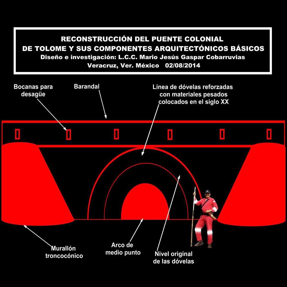 El puente del río Tolome, un afluente del río San Juan entre Paso de Ovejas y Boquerón, media aproximadamente 42.10 metros de longitud, 8 de ancho y 7 de altura, estando dotado de un arco de medio punto con 10.3 metros de ancho y entre 10 y12 bocanas de desagüe para la calzada del camino real. Al igual que sus puentes hermanos, tenia sus arranques protegidos y reforzados por gruesos murallones troncocónicos, que le proporcionaban mucha estabilidad y resistencia al embate de las fuertes crecientes anuales; derivados de los estudios hidrométricos y reconocimientos que García Conde y otros ilustres ingenieros militares realizaron previamente en los rios veracruzanos. Su estructura estaba hecha de mampostería y piedra escuadrada; siendo el puente del Paso Lagartos el que más se le asemejaba. Fue finalizado en el año de 1810 bajo la dirección del arquitecto José Antonio Rincón Calcáneo, segundo al mando del proyecto y quien había dirigido la construcción del Puente del Rey entre 1806 y 1808.