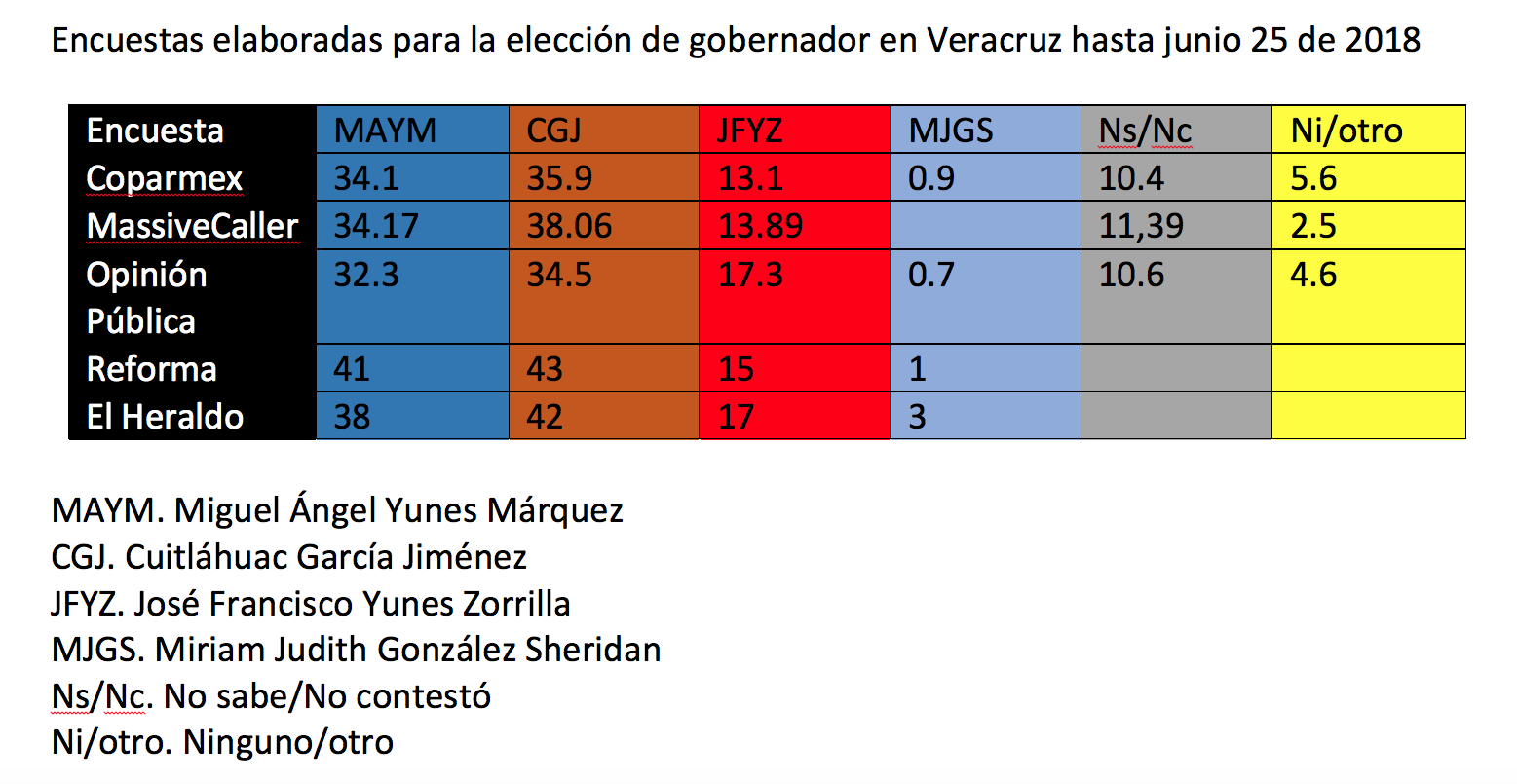 Al amanecer de éste 26 de junio, son ya 5 encuestas serias -con metodología y plataforma de difusión- las que ponen a Cuitláhuac García Jiménez (CGJ) (el candidato de Morena-PT-PES al gobierno del estado) como puntero hacia la elección del 1 de julio y colocan a Miguel Ángel Yunes Márquez (MAYM) (el candidato del PAN-PRD-MC) en un segundo sitio, y en descenso de las preferencias.