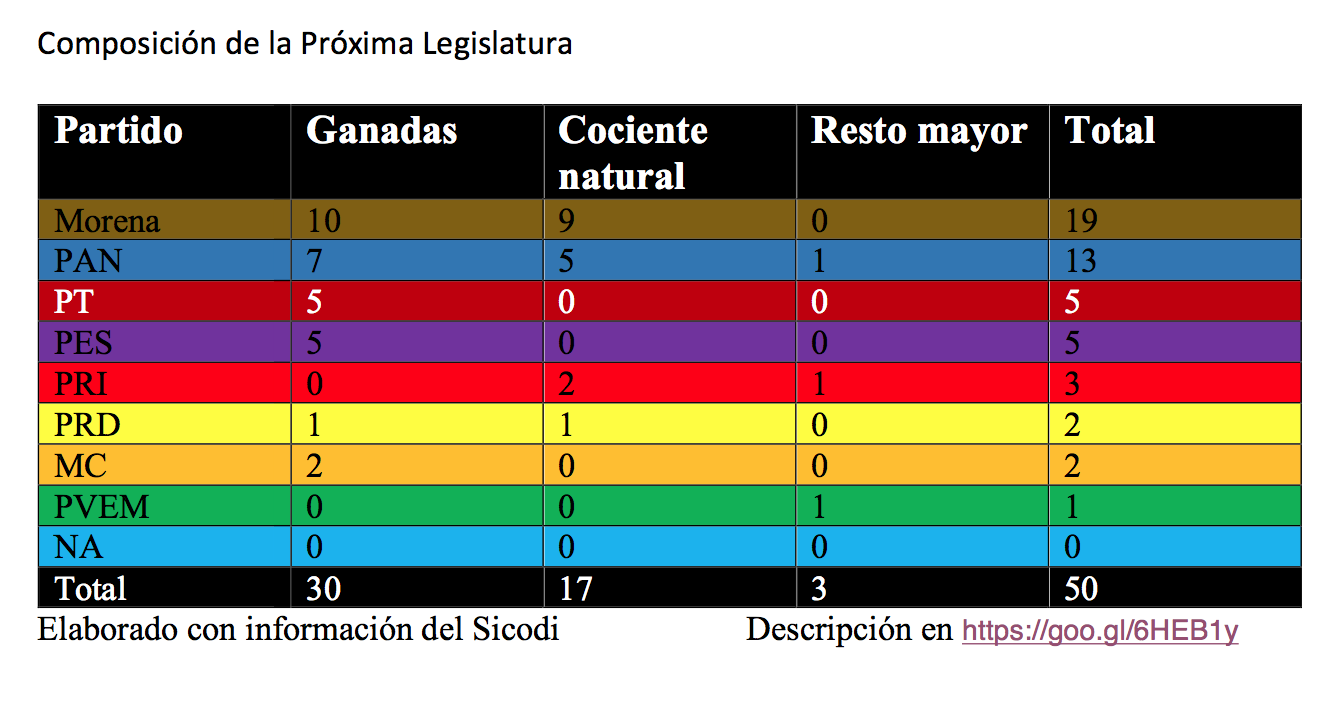 En cambio, por las coaliciones que hicieron, el PT tiene 5 diputados de mayoría, el PES un número igual, y Movimiento Ciudadano 2.