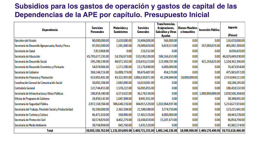 Los aumentos serán para la Secretaría de Desarrollo Agropecuario, Rural y Pesca (Sedarpa) a la cual se le suman 26 millones en este rubro; la Secretaría de Finanzas, a la que se le incrementan 4 millones; Comunicación Social, con un millón y medio más; Protección Civil con 2 millones más; Secretaría de Desarrollo Económico y Portuario (Sedecop), con 600 mil pesos.