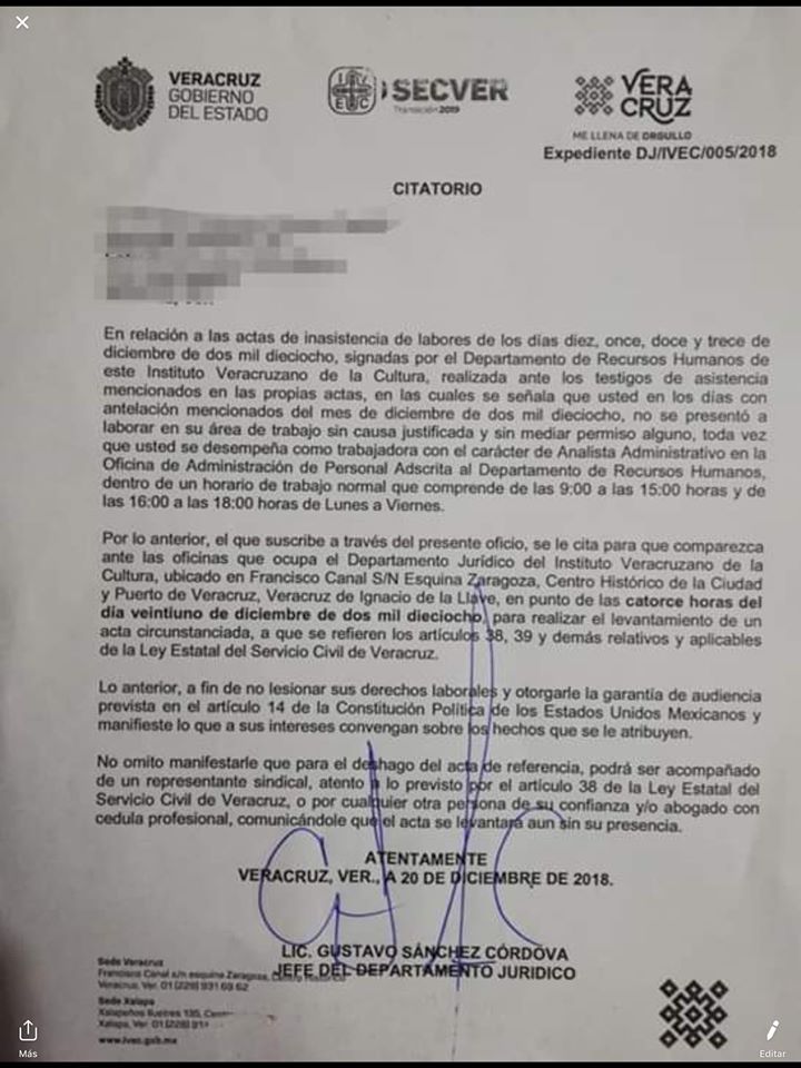 “Por lo anterior, el que suscribe el presente oficio, se le cita para que comparezca ante las oficinas que ocupa el Departamento Jurídico del Instituto Veracruzano de la Cultura”.
