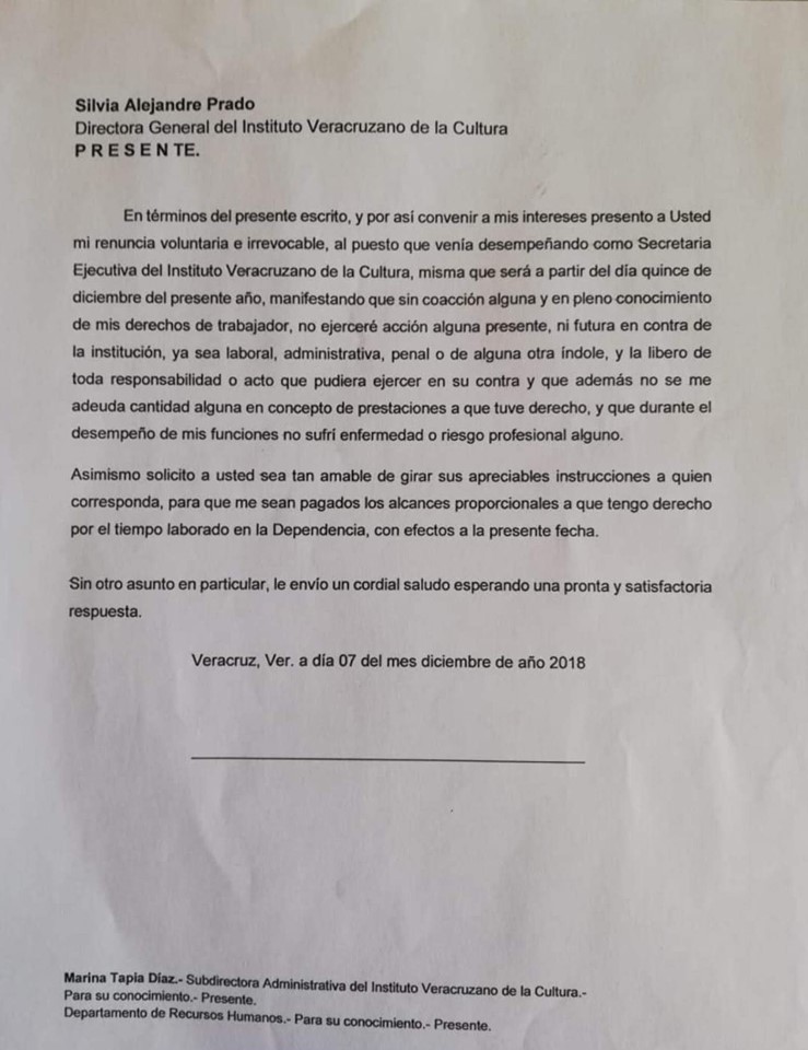 No era más que la renuncia fabricada dirigida a la titular del IVEC, detalle que nos deja claro que era voluntad de la misma Alejandre Prado la idea del despido.