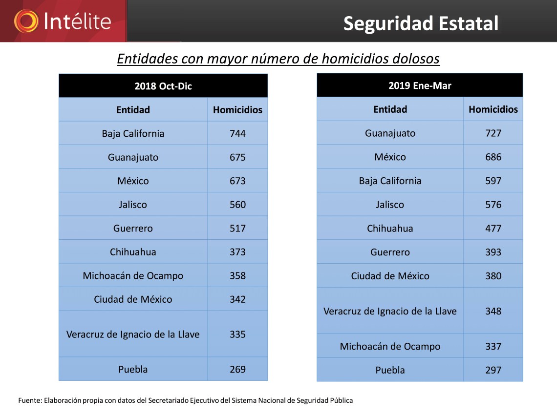 El análisis de Intélite incluye un comparativo de los 10 estados con mayor número de homicidios dolosos perpetrados en el último trimestre de 2018 y el primero de 2019. En ese aglutinamiento se muestra como Veracruz pasó de estar en el lugar 9 a finales del 2018 al lugar 8, en el inicio de éste año, al incrementarse el número de casos de 335 a 348.