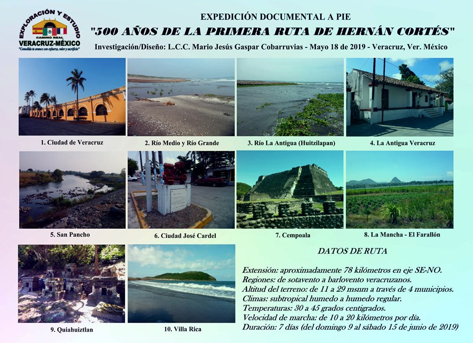 La ruta ha sido trazada sobre mi trabajo de años de investigación en este tema y los resultados de la expedición del camino real de La Antigua a La Ventilla que se efectúo con éxito del 12 al 18 de mayo de 2018. La fecha de partida fue elegida bajo el criterio de reproducir con escasa diferencia la travesía en casi los mismos tiempos que hace cinco siglos: tras fundar el cabildo de la Villa Rica de la Vera Cruz hacia el 20 de mayo de 1519 en los arenales frente al islote de San Juan de Ulúa y siendo abandonado por los mexicas que les aprovisionaban de alimentos, el capitán general y justicia mayor Hernán Cortés ordenó que a fines de mayo o principios de junio, sus infantes y caballería se dirigieran por tierra hacia Cempoala donde serían reabastecidos por los naturales de ese señorío y que la flota se desplazara hasta el puerto en fortaleza frente al pueblo totonaco de Quiahuiztlan, donde quedaría al abrigo de los fuertes vientos del norte.