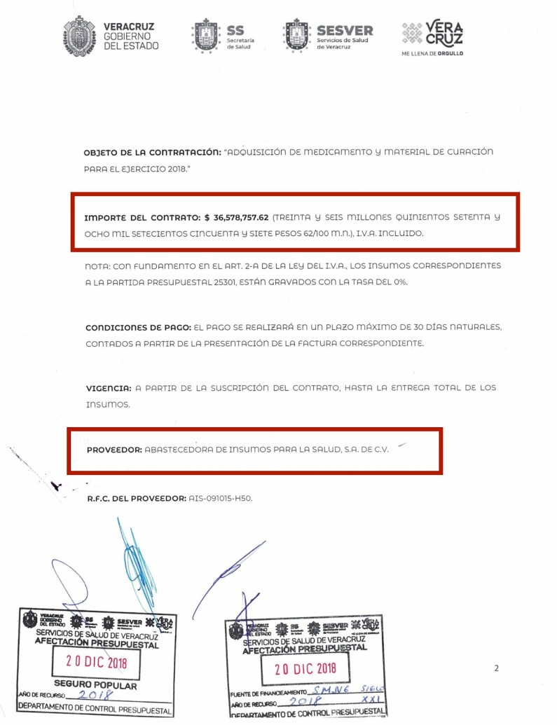 La adjudicación se hizo el 20 de diciembre de 2018, autorizada por Ramos Alor, y operada por el Director Administrativo de Sesver, Jorge Eduardo Sisniega Fernández, el subdirector de Recursos Materiales, Antonio Pola y la subdirectora de Recursos Financieros, Mireya Domínguez Valerio.