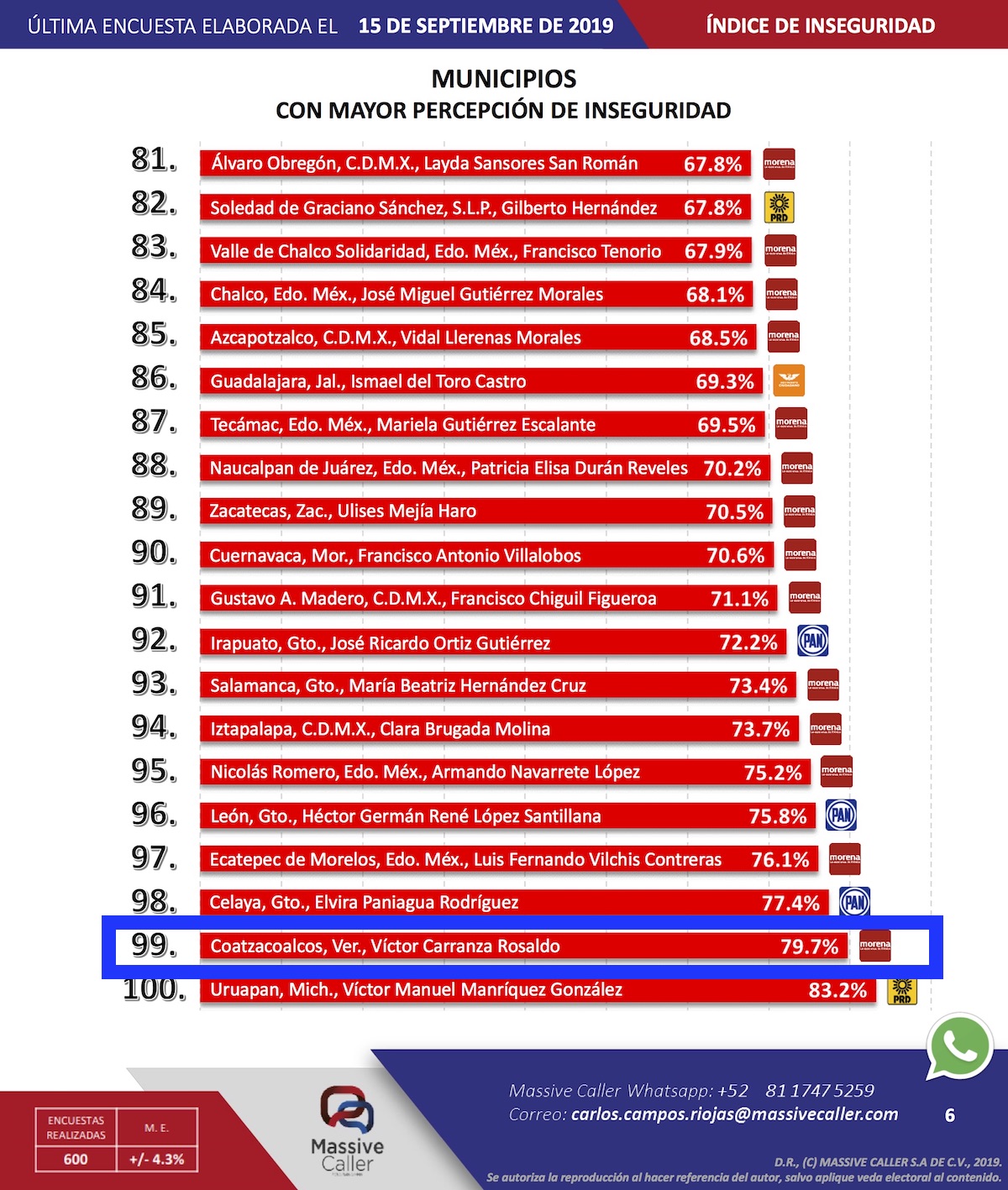 COATZACOALCOS, LA SEGUNDA CIUDAD CON MAYOR SENSACIÓN DE INSEGURIDAD EN EL PAÍS. Coatzacoalcos es el segundo municipio con mayor percepción de inseguridad en el país, de acuerdo con Massive Caller y su encuesta de aprobación de los presidentes municipales de los 100 municipios más grandes del país.