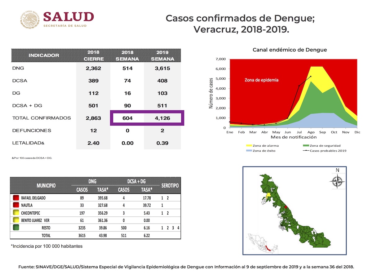 Ese documento pone a Veracruz, el estado, en la zona amarilla, de alarma, pero también incluye a dos municipios con epidemia de dengue.