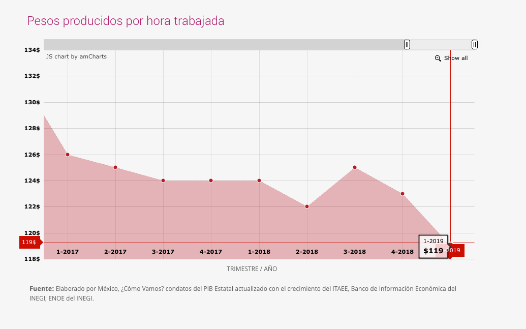 Pero en Veracruz no sólo se han perdido empleos, si no que también la productividad laboral (o sea la riqueza que se produce con el trabajo) a caído, tanto que llegó a su punto más bajo histórico, de sólo 119 pesos.