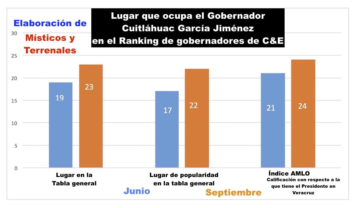 C&E México realiza mediciones trimestrales. En la primera que hizo en junio de 2019, Cuitláhuac García estaba en el lugar 19; para septiembre había descendido al sitio 23; ya estaba entre los 10 peores gobernadores del país. Su popularidad también mermó, pues pasó del sitio 17 al 22.