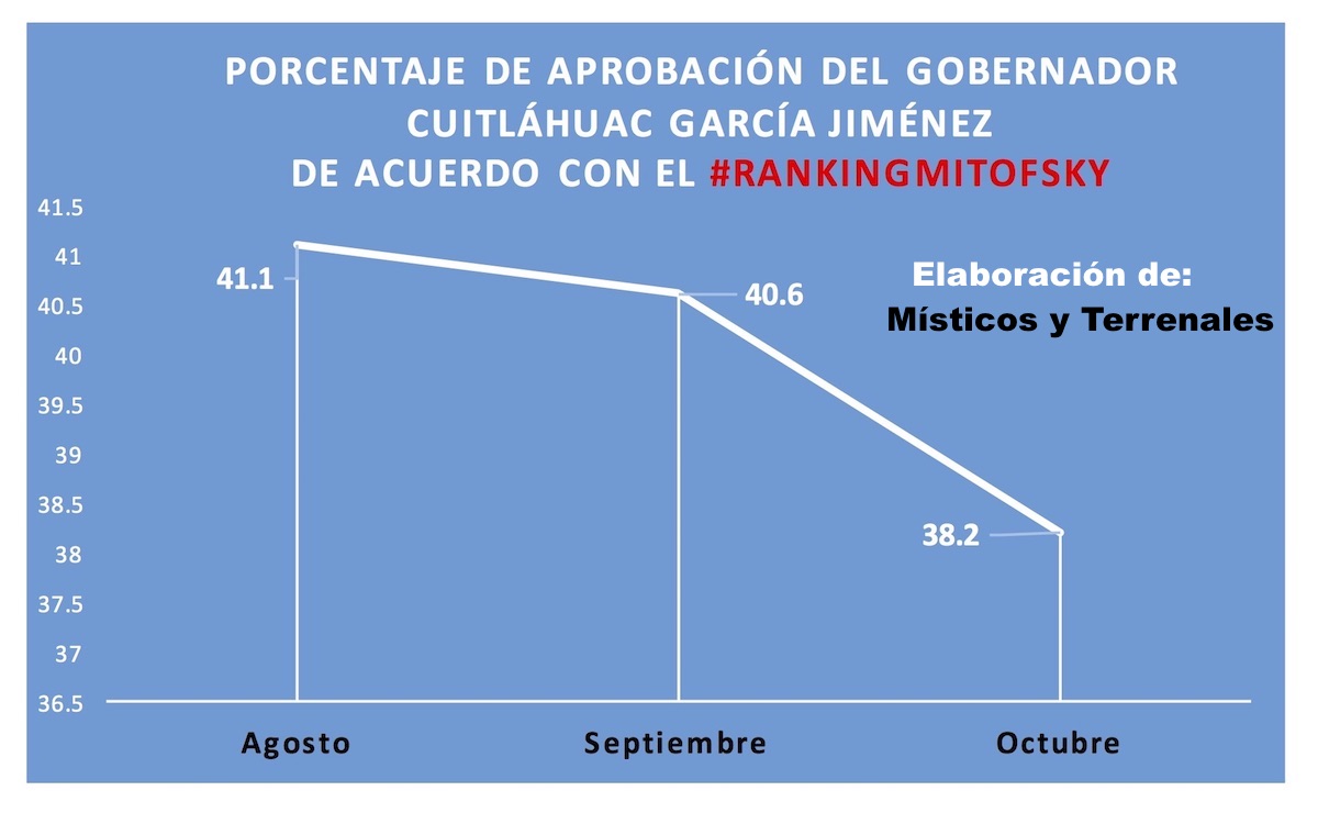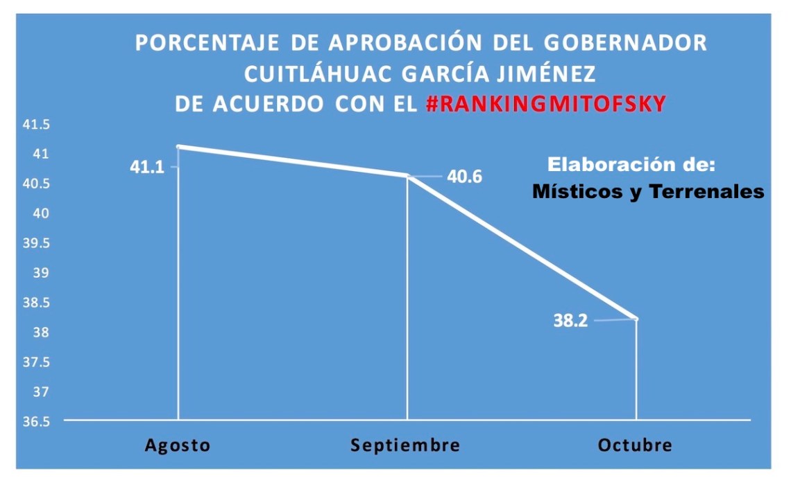 Consulta Mitofsky, en sus mediciones muestra como ha descendido 3 puntos, en tan sólo dos meses: De 41.1 que tuvo en agosto a 38.2 en octubre.