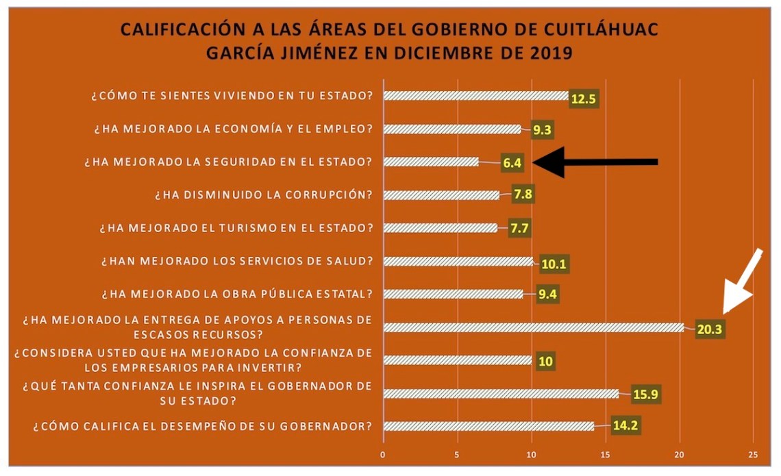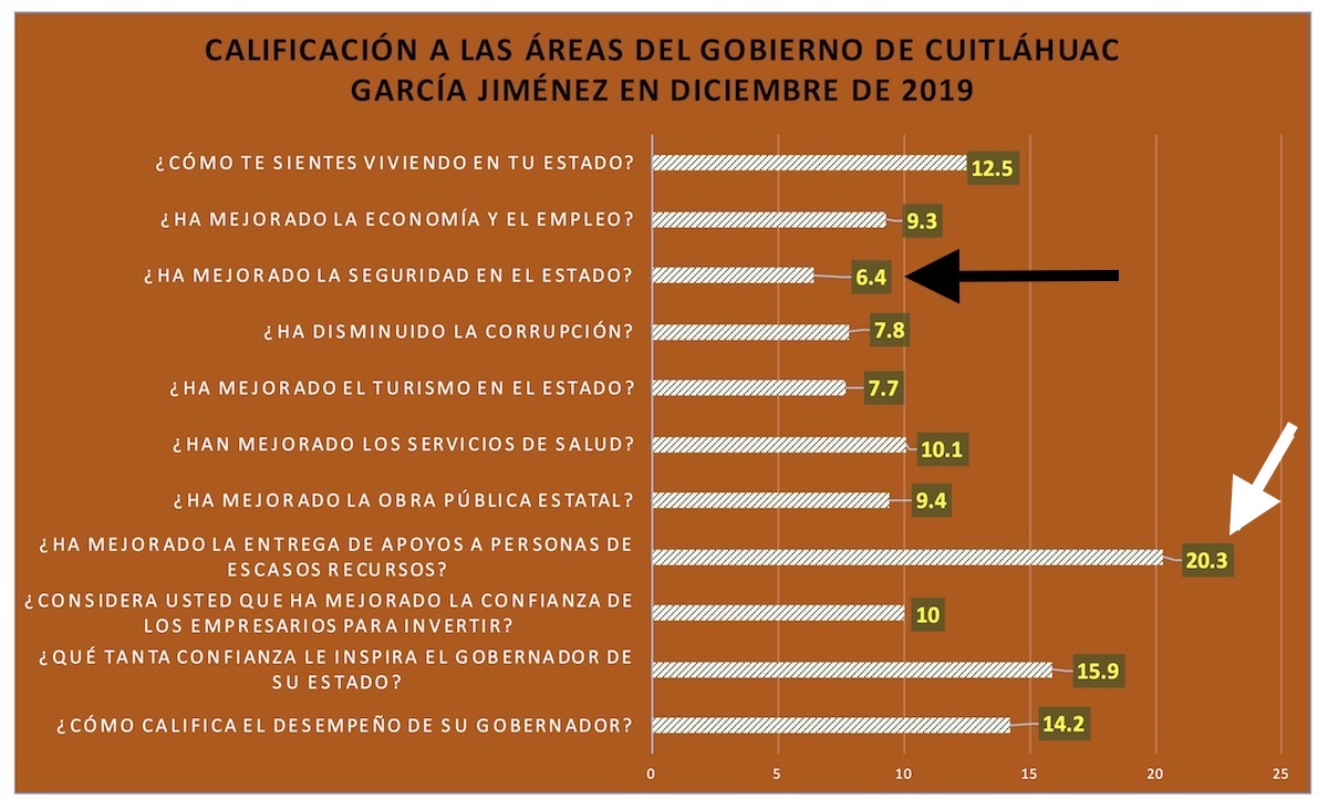 La pregunta que mejor calificación tiene es la de «¿Ha mejorado la entrega de apoyos a personas de escasos recursos?». Y alcanza sólo un 20.3% de aprobación.