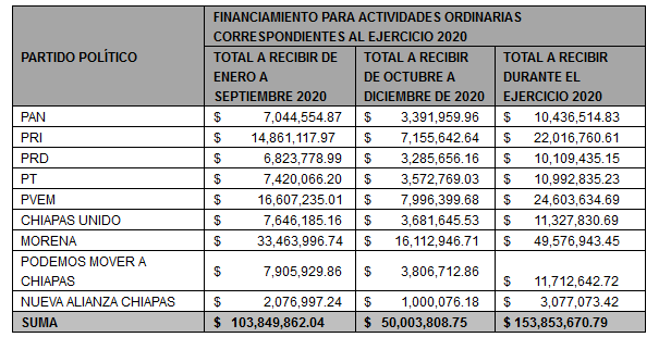 Hay que destacar que el IEPC aprobó el Presupuesto de Egresos y Programa Operativo Anual correspondiente al Ejercicio Fiscal 2020, “bajo criterios de austeridad y racionalidad en base a lo aprobado por el Congreso del Estado de Chiapas”, la suma de: 264 millones 903 mil 821.78 pesos. De eso, se confirman 153 millones, 853 mil 670.81 pesos de financiamiento público a los partidos políticos; 94 millones, 385 mil 014.05 pesos para “proyectos institucionales ordinarios” y 16 millones, 665 mil 136.92 pesos a “proyectos institucionales vinculados al proceso electoral local ordinario 2020-2021”.