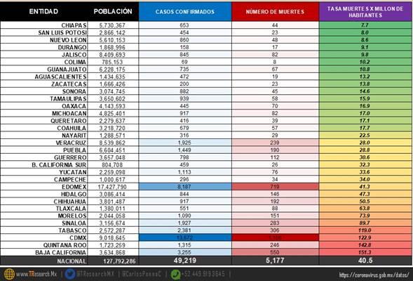 Contagios Detectados Por Entidad: 1 CDMX (13,672) 2 Edomex (8,147) 3 Baja California (3,255) 4 Tabasco (2,381) 5 Sinaloa (1,927) 6 Veracruz (1,925) 7 Puebla (1,449) 8 Quintana Roo (1,315) 9 Yucatán (1113)10 Morelos (1090).