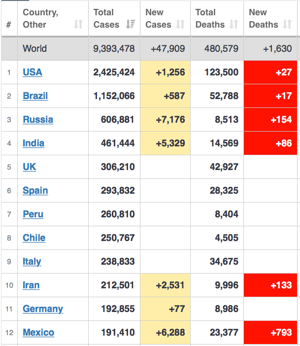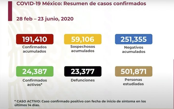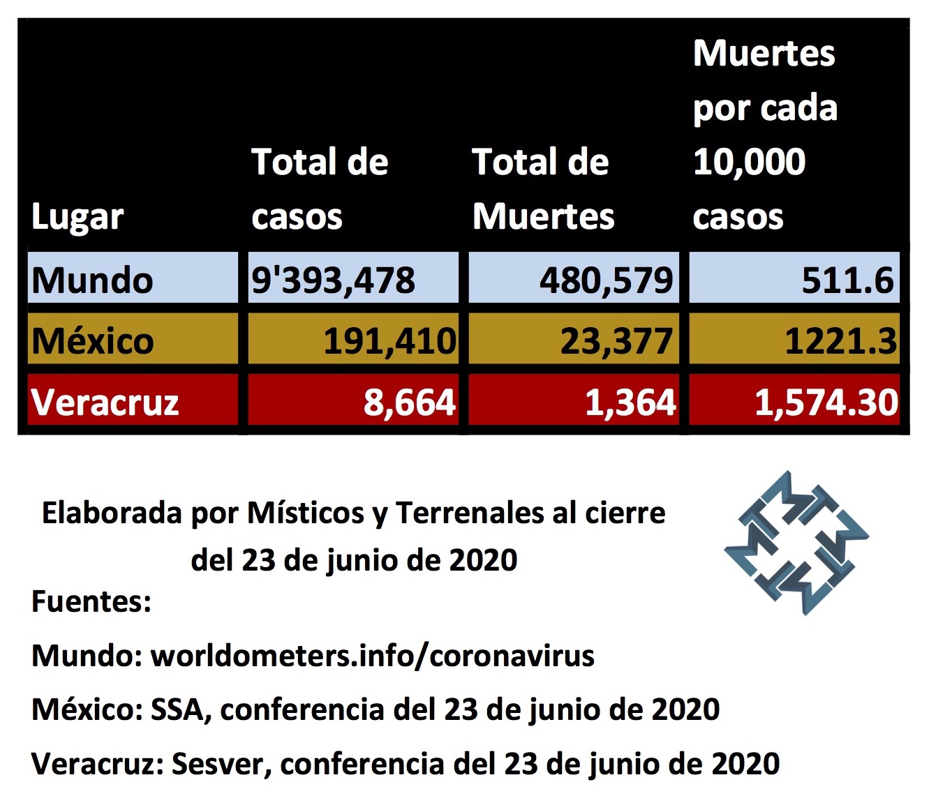 De acuerdo con la página https://www.worldometers.info/coronavirus/ al terminar el 23 de junio había en el mundo 9 millones 393 mil 478 casos registrado de Covid-19, con 480 mil 579 muertes por esta causa.