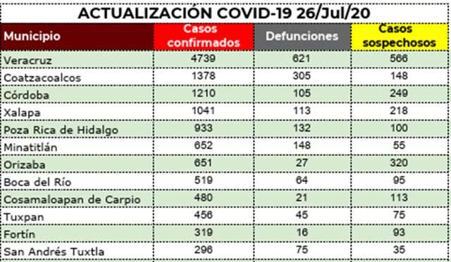 Veracruz encabeza la lista de mayor número de enfermos de todo el estado, ya que tiene 4739 pacientes confirmados, 621 ya fallecieron y 566 son sospechosos de tener el virus.