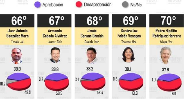 Los cinco alcaldes mejor evaluados del país, son de otras entidades: 1 Adrián Oseguera Kernion de Ciudad Madero, Tamaulipas con 77.4 %. 2 César Garza Villarreal de Apodaca, Nuevo León con 75.8; el tercero es Roberto Sosa Pichardo de Corregidora, Querétaro con 74.1; seguido por Jesús Antonio Nader Nasrallah, de Tampico, Tamaulipas con 73.8 % y en quinto lugar aparece Clara Luz Flores Carrales de General Escobedo, Nuevo León con 71.2 %.