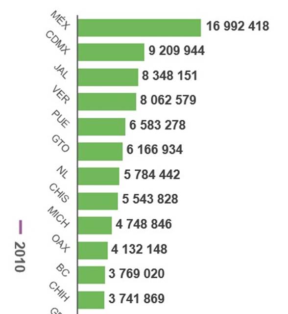 El primer lugar por el número de sus habitantes lo tiene el Estado de México con 16, 992 418.