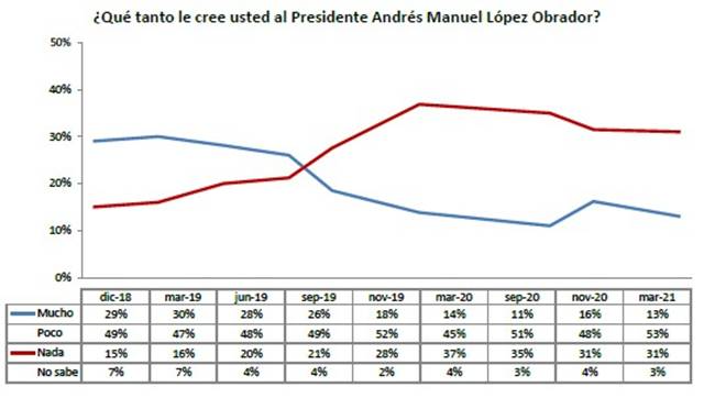 Además, hay otro indicador que revela que el presidente no pasa por su mejor momento, únicamente 13% le cree mucho contra 30% que lo hacía en marzo de 2019, cuando comenzaba su sexenio.
