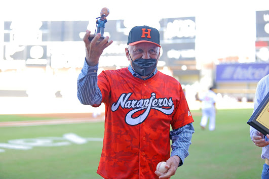 La franquicia Naranjera, como una expresión noble de brindar honor a quien honor merece, ese día lo invitó a que develara una placa con su nombre en la cabina de sonido del estadio y enseguida, previo al inicio del segundo juego de la serie entre Naranjeros y Tomateros de Culiacán, se encargó de realizar el lanzamiento de la primera bola siendo recibido el envío por el receptor César Salazar.
