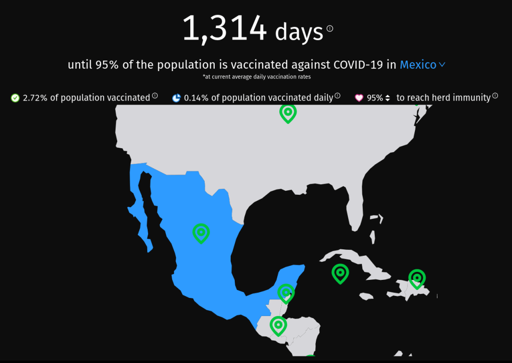 Al ritmo actual de vacunación, de acuerdo con los cálculos de la pagina https://timetoherd.com que concentra la información que emiten todos los países del mundo sobre vacunación, se tendrá vacunado al 95 por ciento de la población en 1,314 días, algo así como 3 años y 6 meses, o sea para finales de 2024, justo cuando deberá realizarse la elección presidencial y de gobernador de Veracruz próxima.