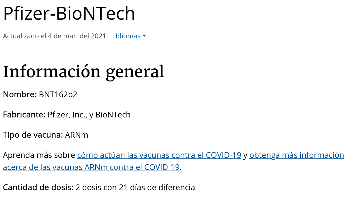 1. La Administración de Alimentos y Medicamentos de EE.UU. (FDA, por sus siglas en inglés), en su “Hoja informativa para receptores y proveedores de cuidado” sobre la vacuna de Pfizer-BioNTech anota que la segunda dosis es “3 semanas después para completar la serie de vacunación” (la anotación está en la pagina 3 y el documento lo puede ver en https://www.fda.gov/media/144625/download )
