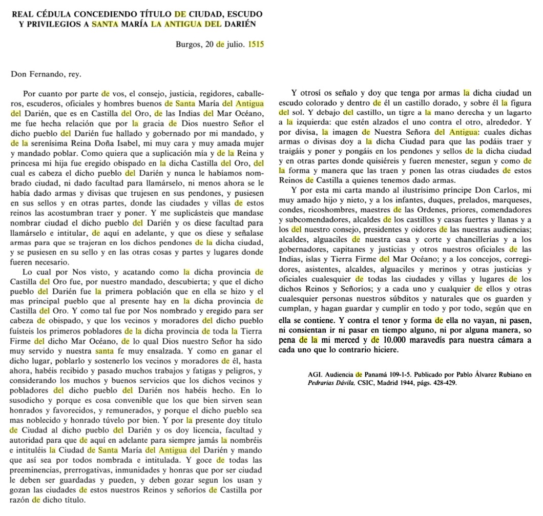 - El primero de tierra continental fue el de la villa de Santa María de La Antigua del Darién, fundada hacia el 20 de septiembre de 1510, siendo sus primeros alcaldes ordinarios el bachiller Martín Fernández de Enciso y el expedicionario Vasco Núñez de Balboa. El 20 de julio de 1515 el rey Fernando el Católico le otorgó título de ciudad, escudo de armas y constituirse como la sede del primer obispado de tierra firme por cédula real (ver imagen). Esta ciudad fue abandonada entre 1519 y 1524. Sus funciones pasaron a la ciudad de Panamá del Sur de Castilla de Oro fundada el 15 de agosto de 1519 por el gobernador Pedro Arias de Dávila. Tras la destrucción de Panamá durante el ataque de los piratas de Henry Morgan en 1671, los habitantes con sus autoridades religiosas y municipales emigraron a un nuevo sitio y el 21 de enero de 1673 fundaron la ciudad de Nueva Panamá encabezados por el gobernador Antonio Fernández de Córdoba y Mendoza, donde radican hasta el día de hoy.