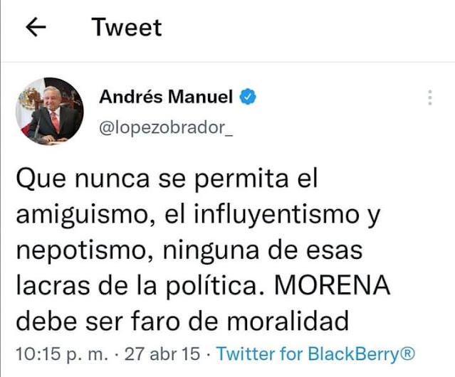 Así que no es de ahora, sino de hace ya muchos años, que López Obrador manifestó su rechazo al “amiguismo”, el “nepotismo” y el “influyentismo”; prácticas que calificó como “las mayores lacras de la política.