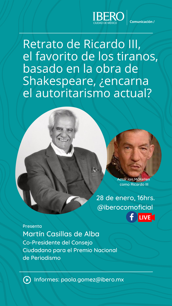 El Consejo Ciudadano del Premio Nacional de Periodismo y la Universidad Iberoamericana te invitan a la plática «Ricardo III: el favorito de los tiranos», imparte Martin Casillas de Alba director de Aulabierta y copresidente del CCPNP.