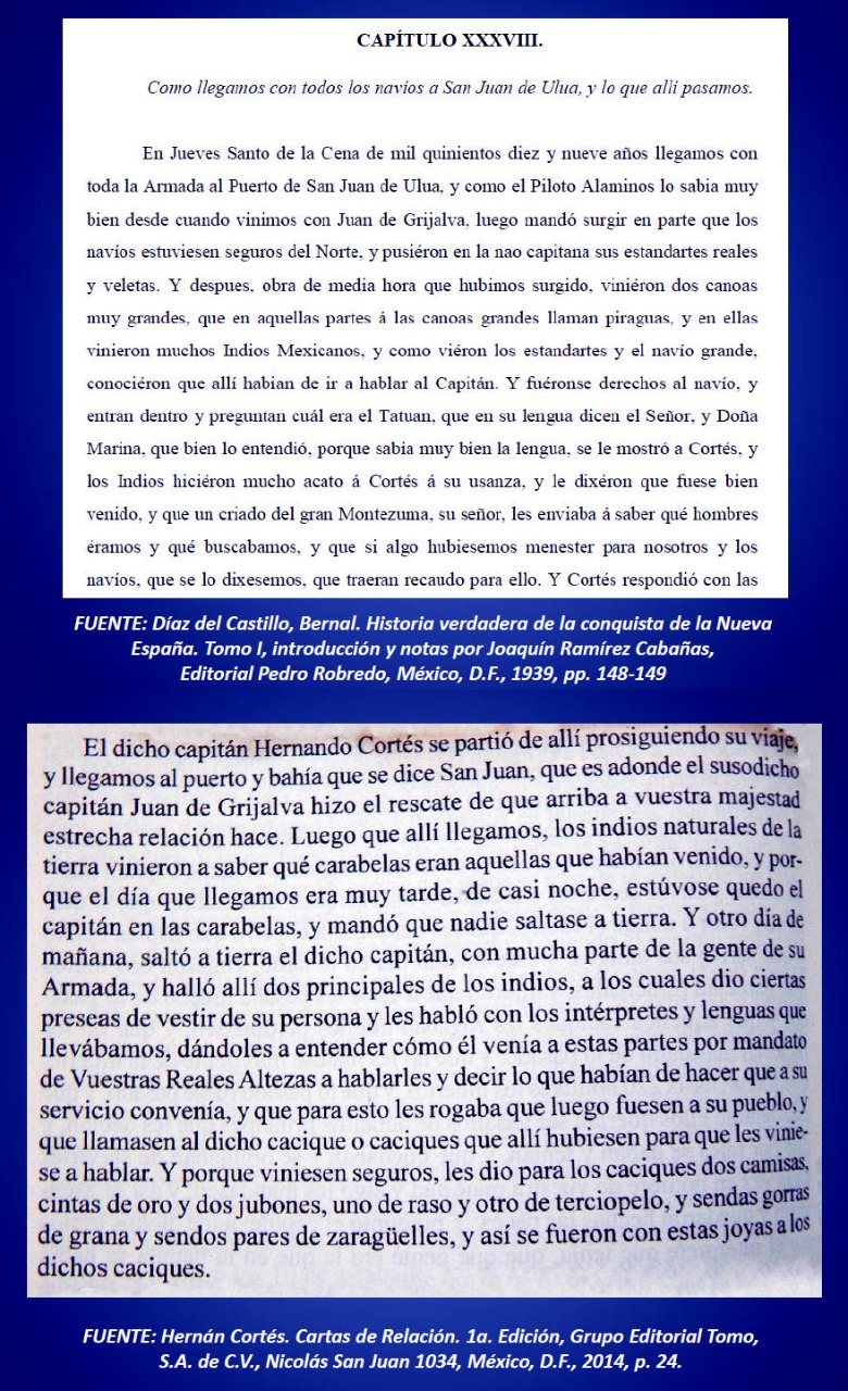 Ambos textos coinciden también en que el sitio ya lo conocían desde los tiempos de la expedición de Juan de Grijalva y que llegaron ahí siguiendo el derrotero trazado por el piloto mayor Antón de Alaminos, que también había participado en esa travesía.