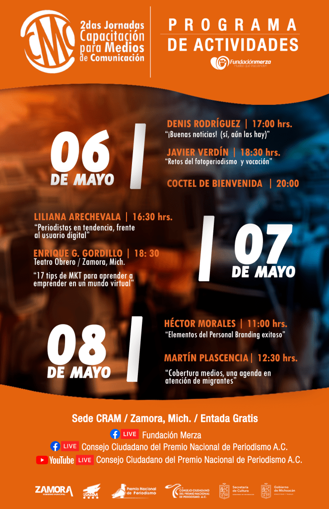 | El Consejo Ciudadano del Premio Nacional de Periodismo en alianza con Fundación Merza, hace una atenta invitación a participar en las Segundas Jornadas de Capacitación para Medios de Comunicación. En Zamora, Michoacán los días 6, 7 y 8 de mayo a partir de las 17.00 horas. Participan periodistas como Javier Verdín Premio Nacional de Periodismo, Denis Rodríguez, Liliana Arechevala, Enrique G. Gordillo, Héctor Morales y Martín Plascencia. Regístrate y participa en: docs.google.com Saludos, Consejo Ciudadano del Premio Nacional de Periodismo AC. |