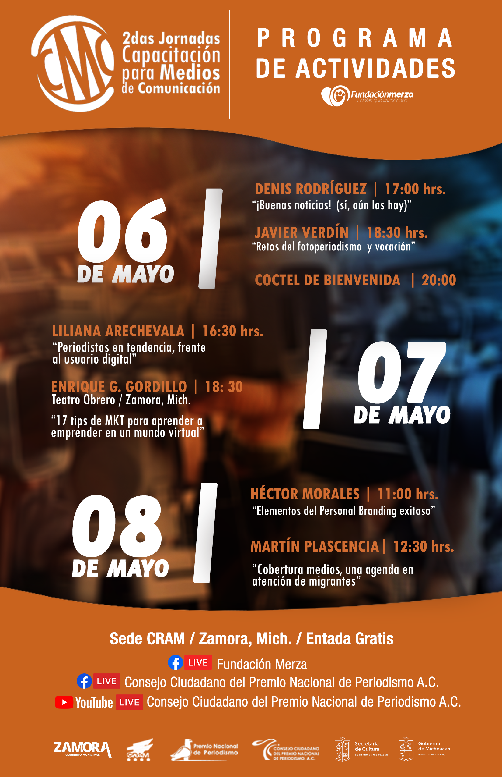 En Zamora, Michoacán los días 6, 7 y 8 de mayo a partir de las 17.00 horas. Participan periodistas como Javier Verdín Premio Nacional de Periodismo, Denis Rodríguez, Liliana Arechevala, Enrique G. Gordillo, Héctor Morales y Martín Plascencia.