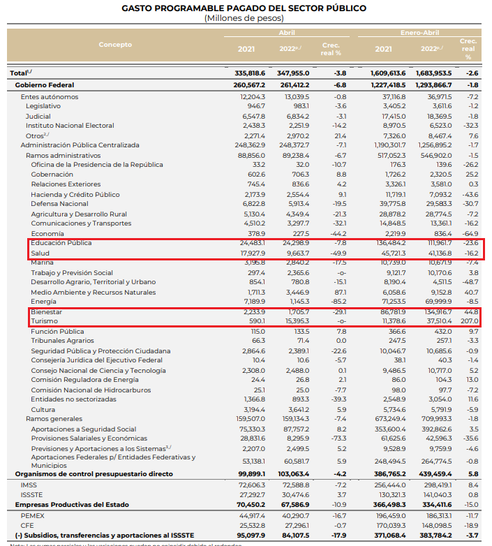 Del informe de finanzas públicas del Gobierno de Andrés Manuel López Obrador de enero-abril 2022.