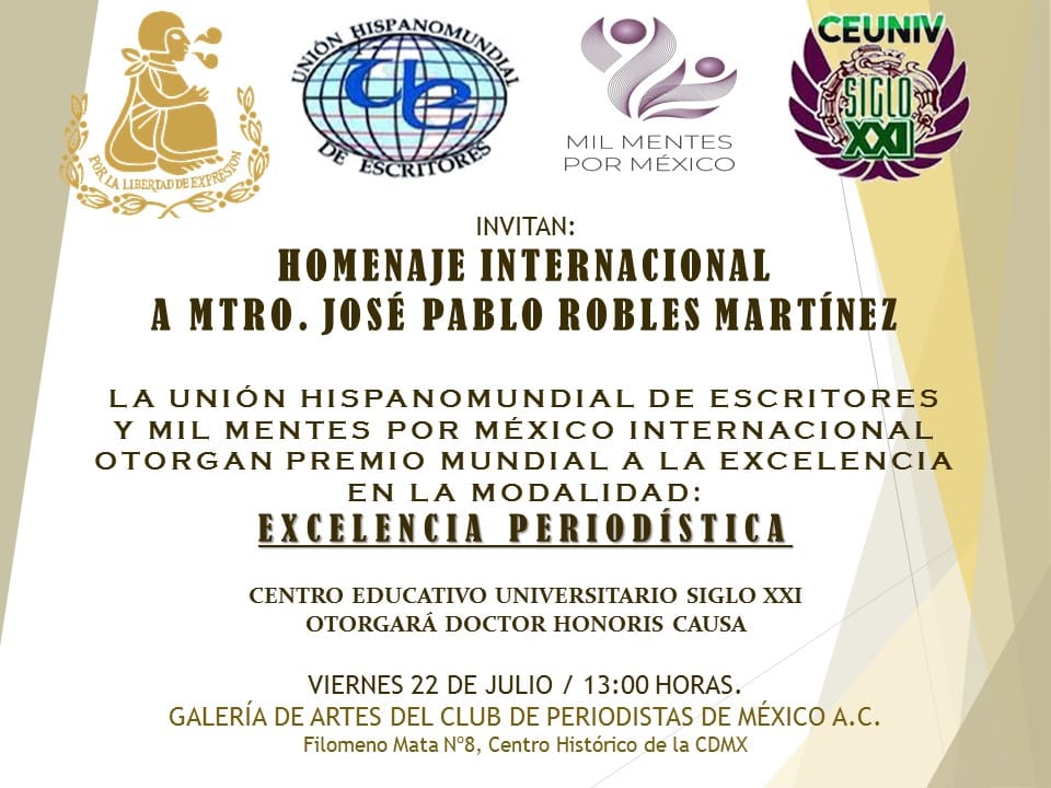 En el marco de un magno homenaje internacional, el maestro José Pablo Robles Martínez, recibirá importante premio latinoamericano de excelencia periodística, el próximo 22 de julio a las 13 horas en la sede del Club de Periodistas de México en la capital del país con la presencia de distinguidos invitados, además de recibir el Doctorado Honoris Causa por parte del Centro Universitario Siglo XXI, por su contribución de larga trayectora a las disciplinas de las Ciencias de la Comunicación y el Periodismo en nuestro país.