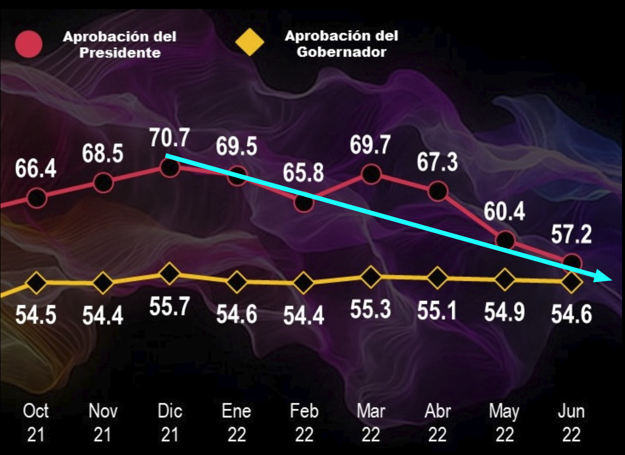 Esa gráfica, identifica que el presidente tuvo su mejor momento de aceptación en la entidad, de acuerdo con las mediciones de la encuestadora, en diciembre del 2021, cuando alcanzó un 70.7%.