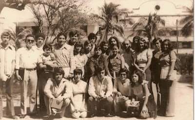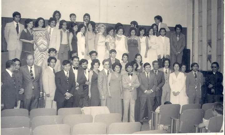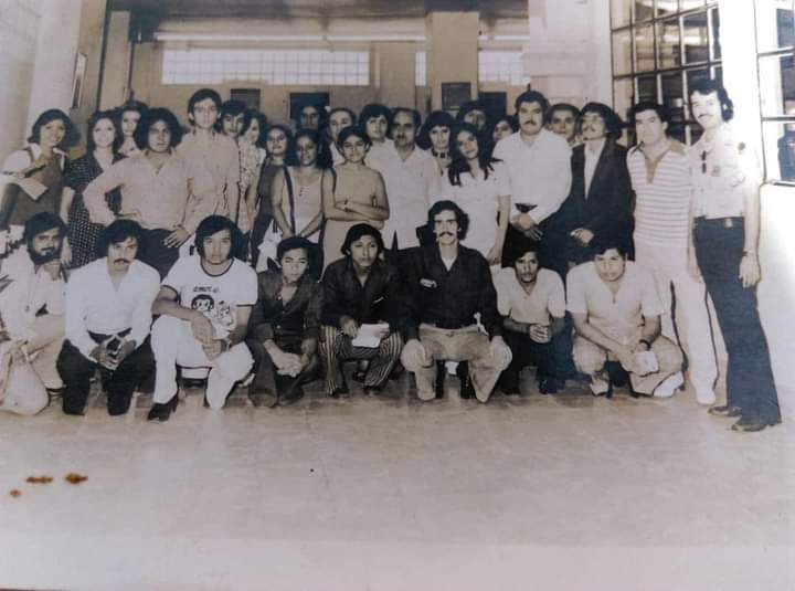 Del edificio de la Facultad, sólo me separaba media cuadra, ahí por Zaragoza y Arista, en el centro de la ciudad. La primera generación de alumnos de la Facultad de Ciencias y Técnicas de la Comunicación en 1974.