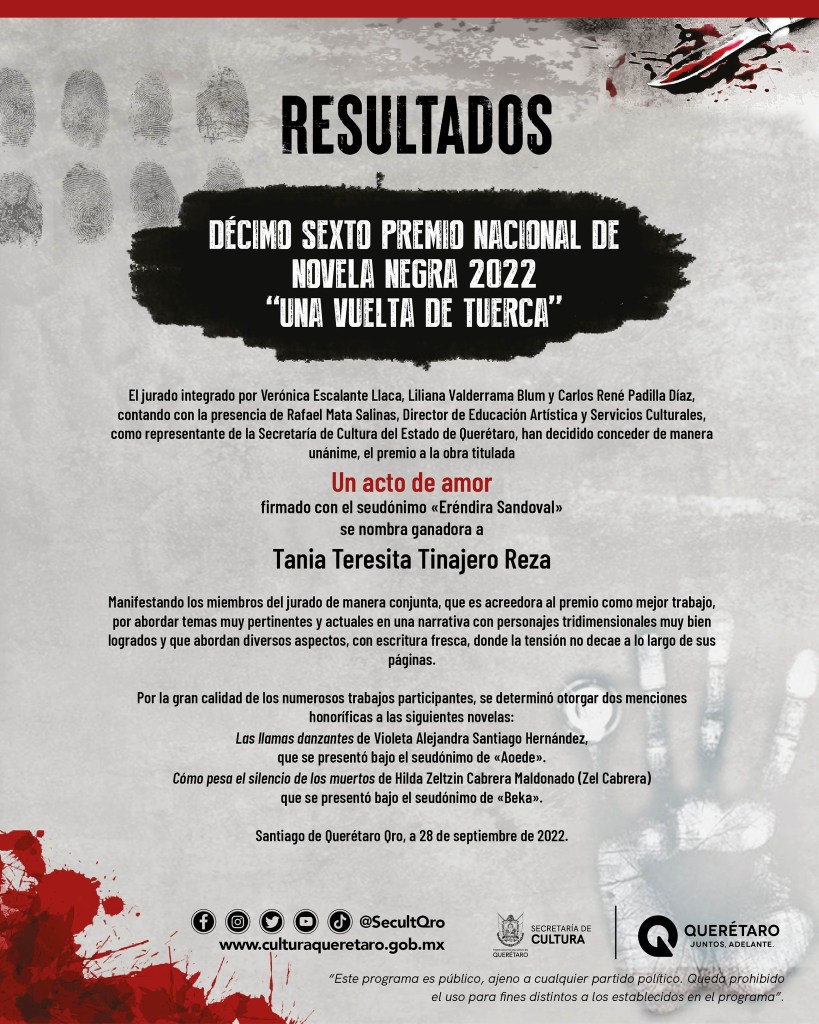 La periodista, Maestra y ahora novelista, Violeta Santiago obtiene mención honorífica para primera novela intitulada «Las Llamas Danzantes», presentada en el Décimo Sexto Premio Nacional de Novela Negra 2022 «Una vuelta de tuerca», organizado por la Secretaría de Cultura del Poder Ejecutivo del Estado de Querétaro, según se dió a conocer esta semana, a través de diversos medios de comunicación.