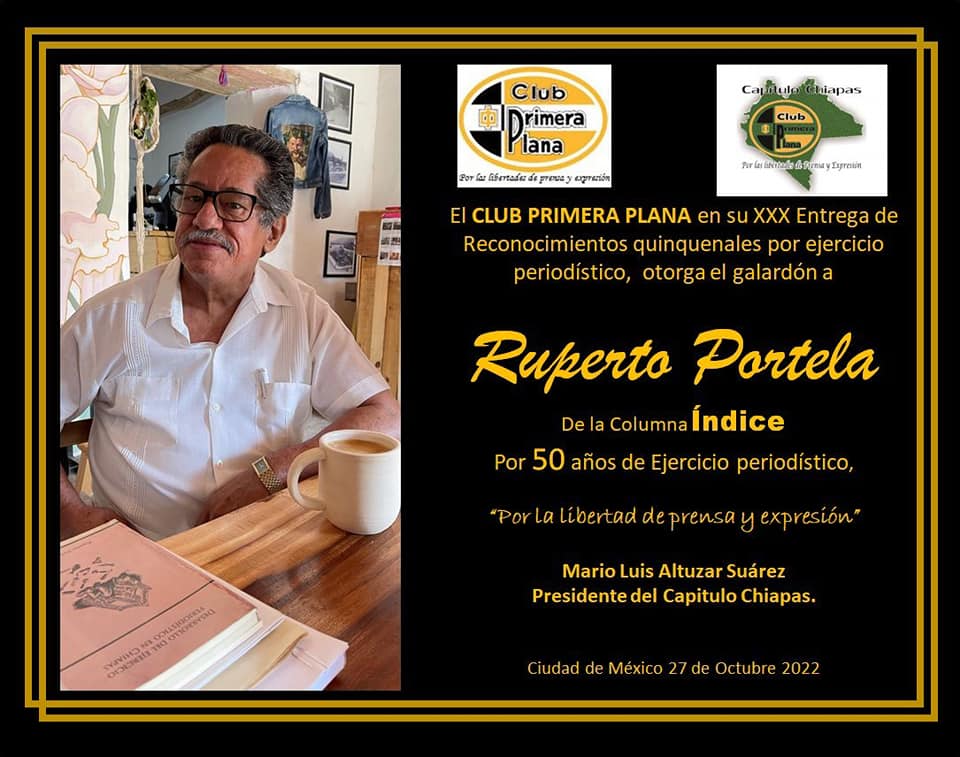 Hoy empiezo por agradecer a la dirigencia e integrantes del Club de Periodistas se San Cristóbal de las Casas el haberme distinguido con la medalla «Manuel Burguete Estrada» el pasado 7 de octubre.