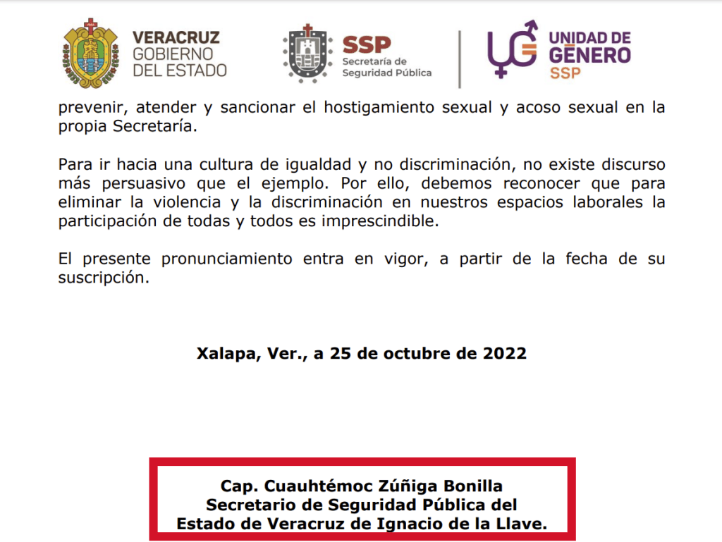 al acoso sexual”, el cual fue firmado por el mismo titular de la dependencia, Cuauhtémoc Zúñiga, el 25 de octubre de 2022.