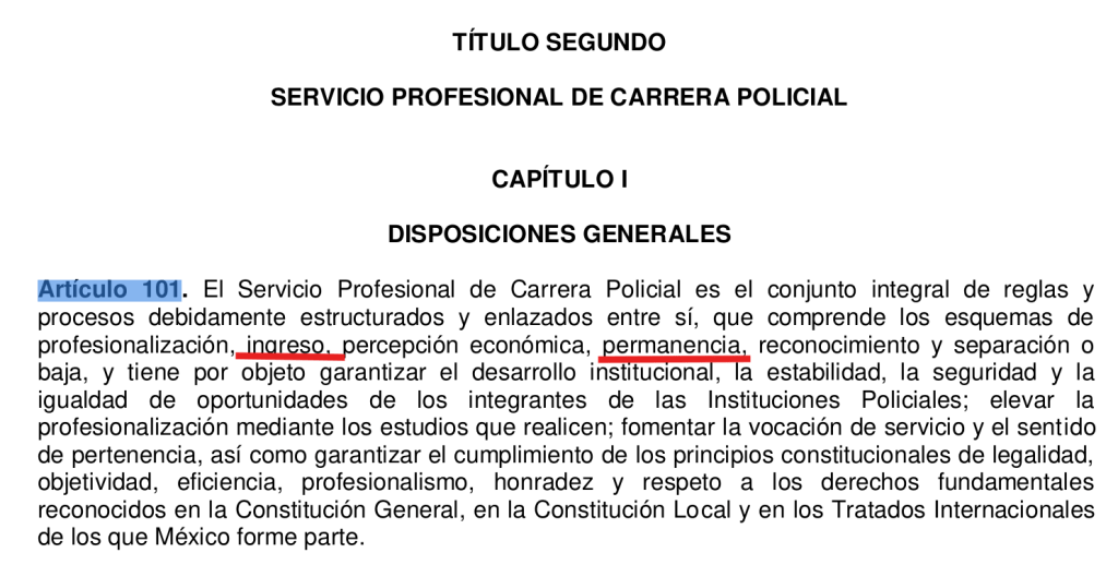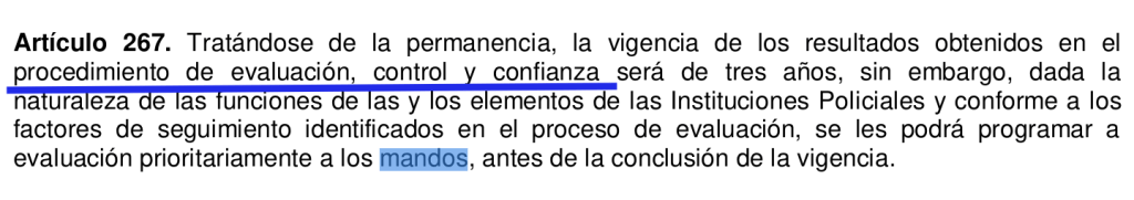 Este ordenamiento en su artículo Artículo 267 anota que la permanencia en el cargo se supedita a “los resultados obtenidos en el procedimiento de evaluación, control y confianza”, los cuales tendrán una vigencia de tres años.