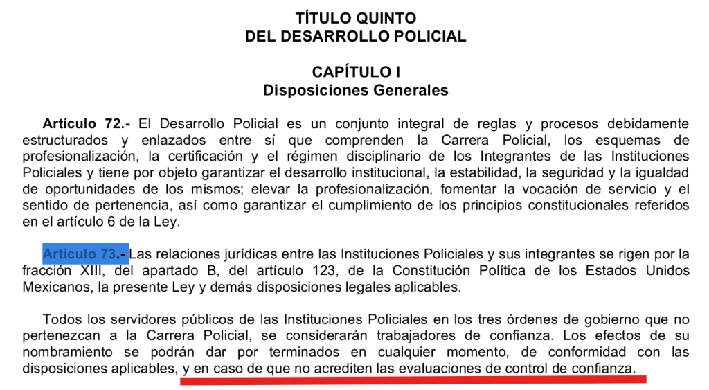 “Todos los servidores públicos de las Instituciones Policiales en los tres órdenes de gobierno que no pertenezcan a la Carrera Policial, se considerarán trabajadores de confianza. Los efectos de su nombramiento se podrán dar por terminados en cualquier momento, de conformidad con las disposiciones aplicables, y en caso de que no acrediten las evaluaciones de control de confianza”.