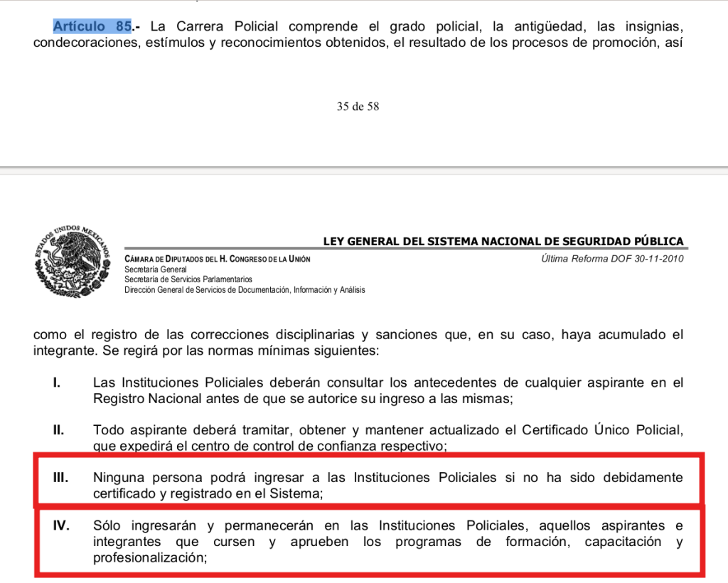 Tan sólo el artículo 39 de la Ley General del Sistema Nacional de Seguridad Pública (LGSNSP) establece bien claramente que “la Federación, el Distrito Federal, los Estados y los Municipios” deberán “abstenerse de contratar y emplear en las Instituciones Policiales a personas que no cuentan con el registro y certificado emitido por el centro de evaluación y control de confianza respectivo”.