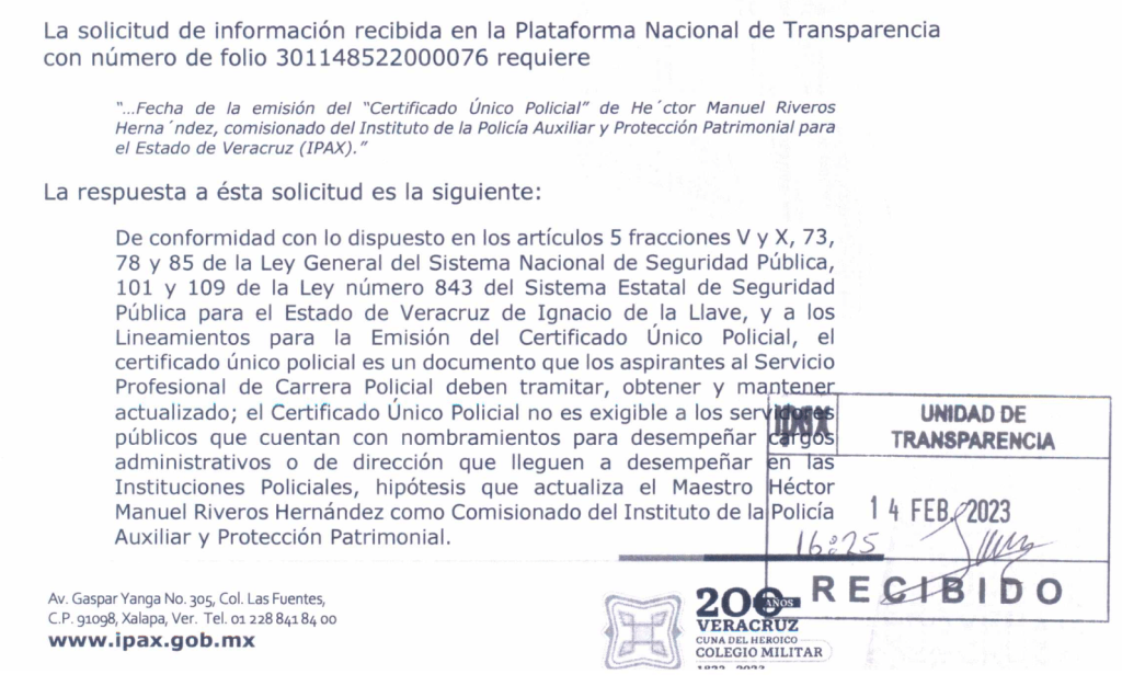 «De conformidad con lo dispuesto en los articulos 5 fracciones V y X, 73, 78 y 85 de la Ley General del Sistema Nacional de Seguridad Pública, 101 y 109 de la Ley número 843 del Sistema Estatal de Seguridad Pública para el Estado de Veracruz de Ignacio de la Llave, y a los Lineamientos para la Emisión del Certificado Único Policial, el certificado único policial es un documento que los aspirantes al Servicio Profesional de Carrera Policial deben tramitar, obtener y mantener actualizado; el Certificado Único Policial no es exigible a los servidores públicos que cuentan con nombramientos para desempeñar cargos administrativos o de dirección que lleguen a desempeñar en las Instituciones Policiales, hipótesis que actualiza el Maestro Héctor Manuel Riveros Hernández como Comisionado del Instituto de la Policía Auxiliar y Protección Patrimonial».