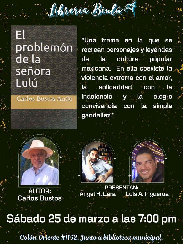 Este sábado 25 de marzo, Carlos Bustos Ando, miembro de la primera generación de Licenciados en Ciencias y Técnicas de la Comunicación de la Universidad Veracruzana, presenta su novela «El problemón de la Señora Lulú», comentado por Ángel H. Lara y Luis A. Figueroa, en el local ubicado en Colón Oriente numero 1152, junto a la Biblioteca Municipal.