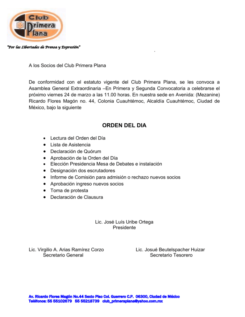 Convocatoria a Asamblea General Extraordinaria del Club Primera Plana