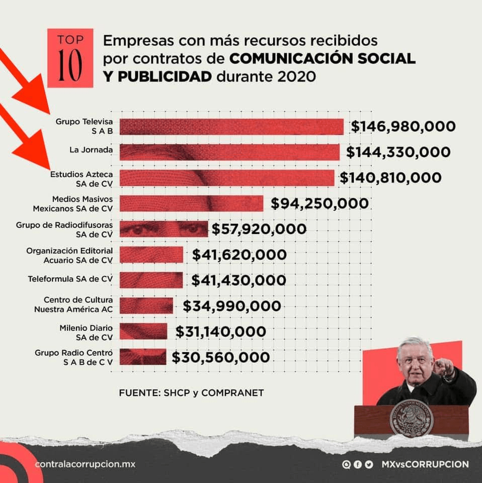 Se debe consignar que la trascendencia de las “mañaneras” se debe a las réplicas que hacen las televisoras y radiodifusoras en sus diversos programas noticiosos de los dichos del “Prejimiente”; siendo válido lo hacen por negocio y contratos que tienen como empresa firmados con el Gobierno de la 4T. Para eso el “Mil Chistes” destina millones de pesos en su promoción e imagen donde TELEVISA es su principal proveedor con casi 846 MILLONES, 668 MIL 680 PESOS en estos 4 años del poder morenista.