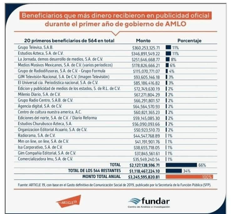 El Gobierno de 4T que no paga para que le peguen, tiene una estrecha relación con el “Grupo Salinas Pliego” de RICARDO BENJAMÍN SALINAS PLIEGO, al que le ha pagado por concepto de publicidad a sus empresas: “Estudios Azteca” y “Estudios Churubusco Azteca”, un promedio de 849 MILLONES 906 MIL 335.22 PESOS en estos dos tercios del sexenio.