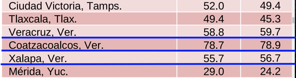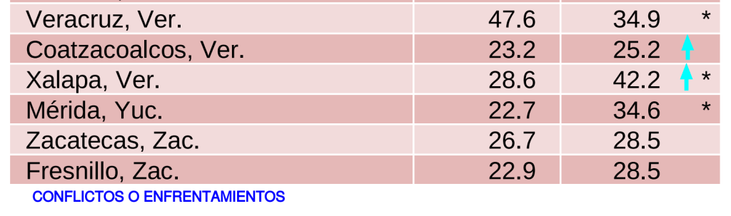 Paradójicamente, Coatzacoalcos es la ciudad que tiene los más bajos índices de conflictos o enfrentamientos, pero aún así su índice creció, pues pasó de un 23.2% a un 25.2%.
