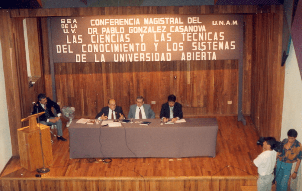 Del histórico momento de su visita, sucedida en el año de 1992, recuperaremos algunas ideas de la conferencia del Dr. Pablo González Casanova, que impartió a nuestro profesorado reunido en la entonces Galería de Arte Contemporáneo de Xalapa, ubicada en la calle de Xalapeños Ilustres. Le acompañaron en el presídium el Secretario Académico de la Universidad Veracruzana, Dr. Félix Báez Jorge, y el Director General del SEA, Lic. Ernesto Canseco Sedano. El Dr. González Casanova presentaba una adaptación de su conferencia denominada «Los Sistemas de Universidad Abierta y las Ciencias y Técnicas del Conocimiento», que recién había presentado en otros foros universitarios, durante los meses anteriores.