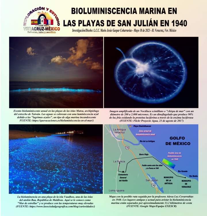 Lo que mi madre pudo contemplar aquella alborada de 1940, fue precisamente una bioluminiscente causada por una enorme concentración de algas Noctiluca scintillans. Actualmente en el siglo XXI, el mismo fenómeno se produce anualmente en el mes de marzo en la playa Chalchihuecan, en la misma línea de costa donde mi madre lo vio en 1940, pero unos 13.2 kilómetros más al noroeste, pasando la desembocadura del río La Antigua.